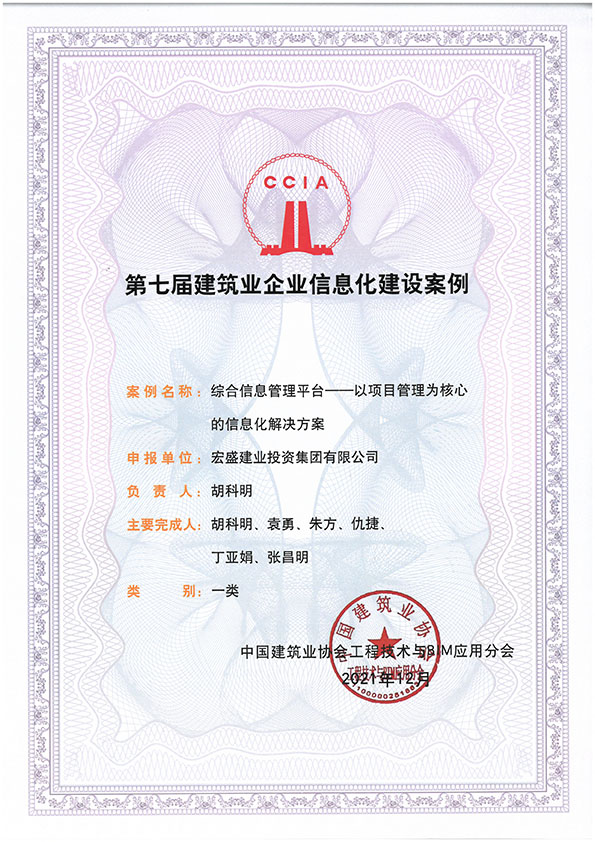 近日,中國建筑業(yè)協(xié)會第七屆建筑業(yè)企業(yè)信息化建設案例征集活動落下帷幕,經過評審團層層篩選、嚴格把關、優(yōu)中選優(yōu),宏盛建業(yè)最終憑借“綜合信息管理平臺——以項目管理為核心的信息化解決方案”成功上榜建筑企業(yè)信息化一類成果,本次共評選出建筑業(yè)企業(yè)信息化建設一類成果43個,二類成果52個,三類成果43個。