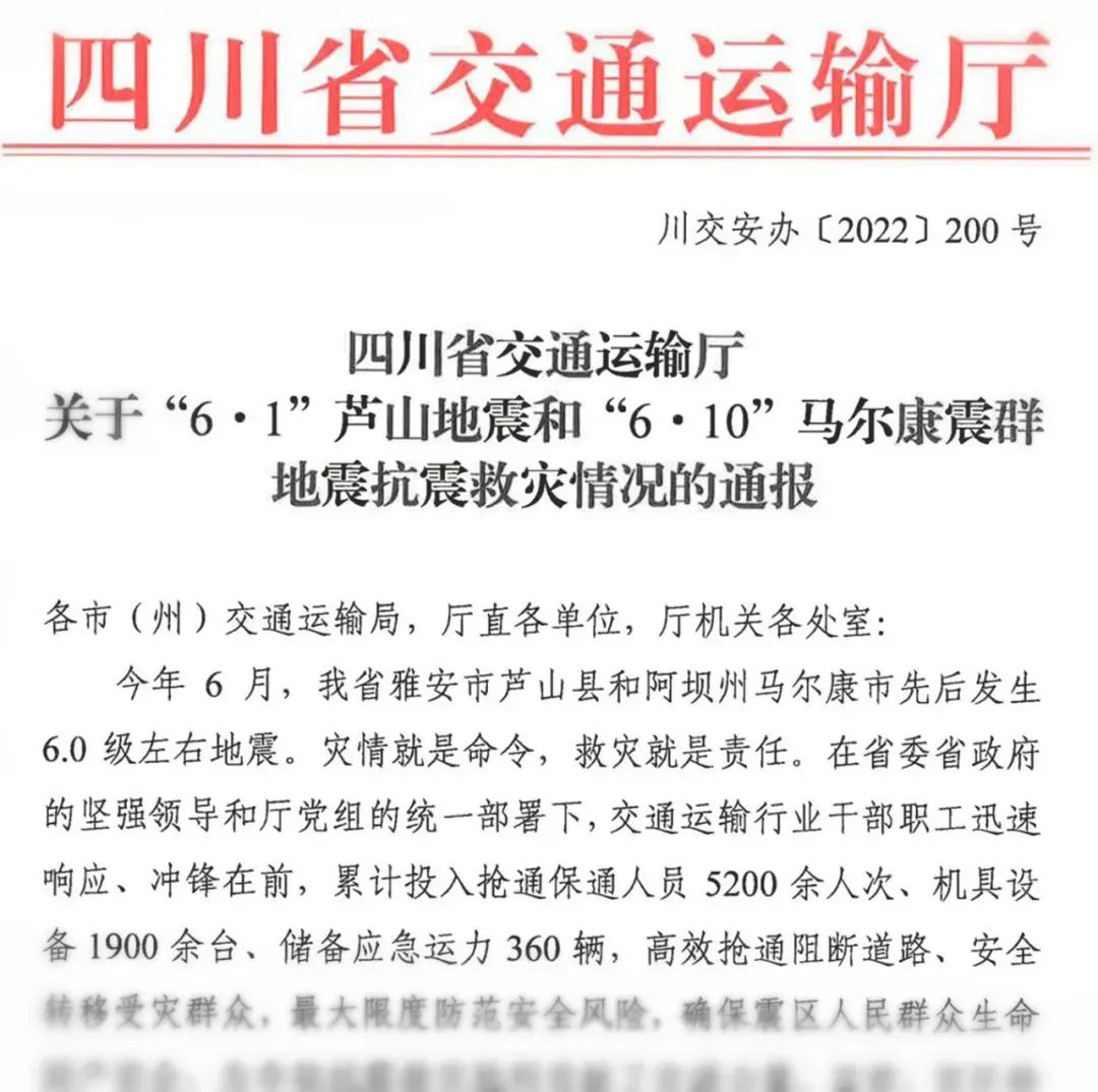 今年6月,我省雅安市蘆山縣和阿壩州馬爾康市先后發(fā)生6.0 級左右地震。災情就是命令,救災就是責任。在省委省政府的堅強領導和廳黨組的統(tǒng)一部署下,交通運輸行業(yè)干部職工迅速響應、沖鋒在前,累計投入搶通保通人員5200余人次、機具設備1900余臺、儲備應急運力360 輛,高效搶通阻斷道路、安全轉移受災群眾,最大限度防范安全風險,確保震區(qū)人民群眾生命財產(chǎn)安全,為奪取抗震救災勝利貢獻了交通力量。目前,災區(qū)搶險救災工作已經(jīng)完成,受災群眾得到妥善安置,交通運輸秩序全面恢復,災后恢復重建工作有序推進。