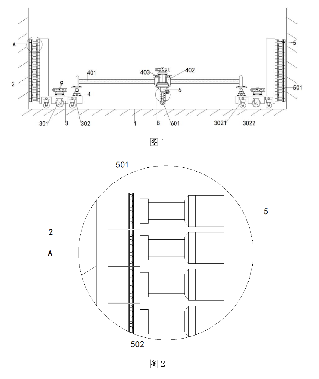 在建筑進行全面投入建設之前,需要對建筑的一系列指標進行檢測,檢測過關之后才能進一步的開展對建筑的建設工作,其中的檢測工作就包括對房間內地面與墻面的平坦度的測量工作,因此需要一種便于調節(jié)的建筑用測量裝置。本實用新型中,通過設置水平調節(jié)結構,通過使電動伸縮桿A、剎車腳輪與水平儀之間配合使用,可以對裝置與水平面之間調節(jié)平行,方便對后續(xù)測量工作進行開展。