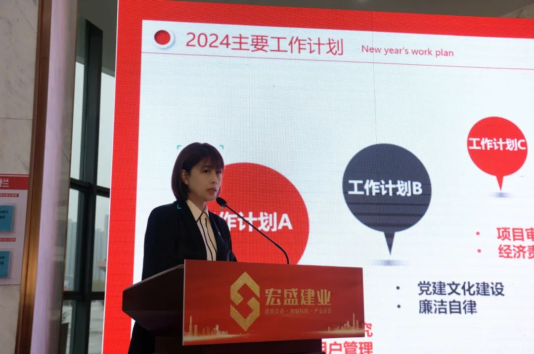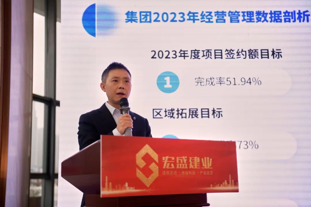 會上,集團黨委書記、副董事長、總裁周金旺作主題為“新戰(zhàn)略 新起點 以終為始 再戰(zhàn)新高”的年度工作報告,從黨建品牌、創(chuàng)優(yōu)創(chuàng)標、客戶服務(wù)及內(nèi)部團隊培養(yǎng)四方面總結(jié)一年來的成果。通過經(jīng)營數(shù)據(jù)、財務(wù)數(shù)據(jù)和成本分析、人力資源分析、項目管控分析、風險管控分析五大方面進行了全面剖析,并提出2024年是宏盛新的起點,我們的戰(zhàn)略將全面升維。