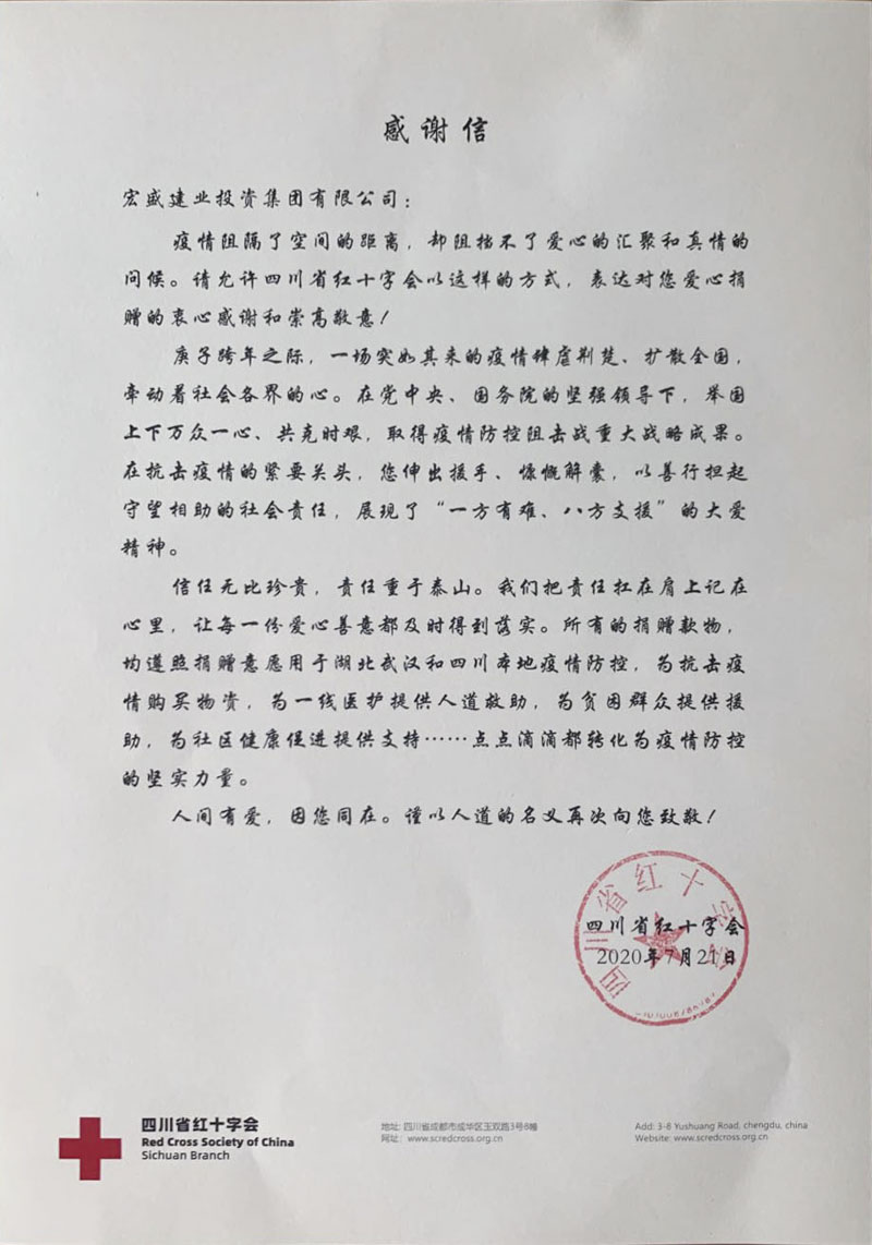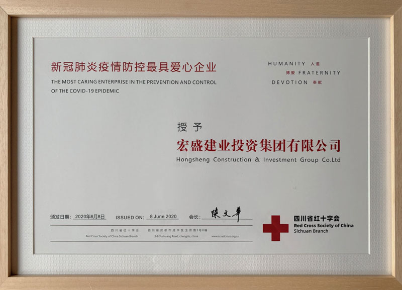 近日,為表彰宏盛建業(yè)集團在防疫工作中的突出貢獻,四川省紅十字會授予集團“新冠肺炎疫情防控最具愛心企業(yè)”榮譽稱號。