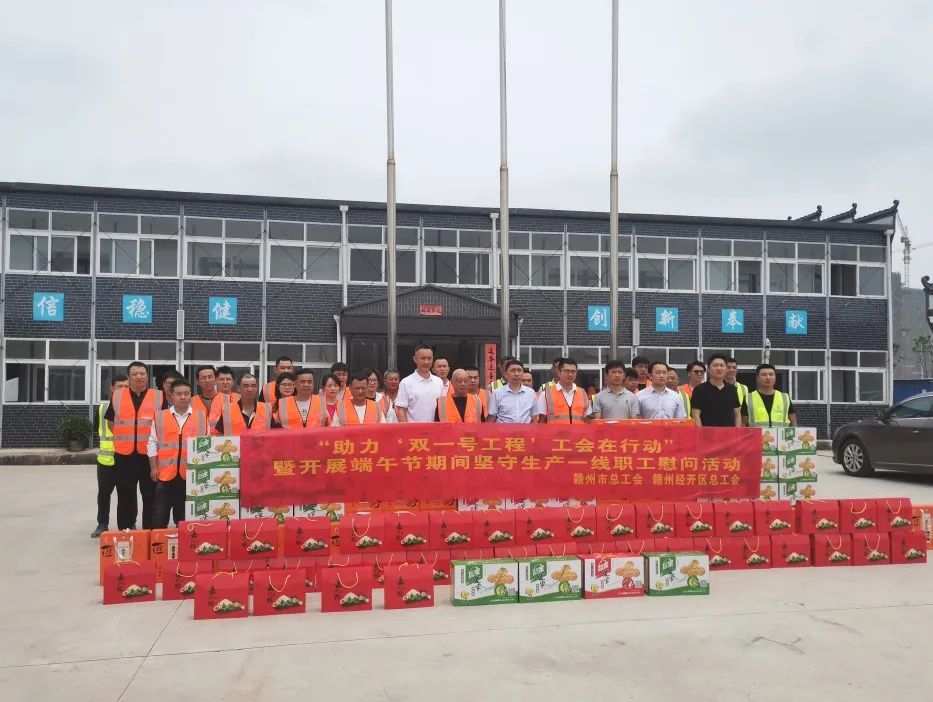 5月31日,贛州市總工會(huì)二級(jí)調(diào)研員賴定銘一行,來(lái)到贛州經(jīng)濟(jì)技術(shù)開(kāi)發(fā)區(qū)文化藝術(shù)中心(A、C)地塊建設(shè)項(xiàng)目部,開(kāi)展“工會(huì)情·‘粽’相隨”走訪慰問(wèn)活動(dòng)。為端午節(jié)期間不停工、時(shí)刻奮戰(zhàn)項(xiàng)目建設(shè)一線的廣大職工們送來(lái)了黨和政府以及上級(jí)工會(huì)組織的關(guān)懷和慰問(wèn)。項(xiàng)目負(fù)責(zé)人葉興武及全體管理人員陪同。