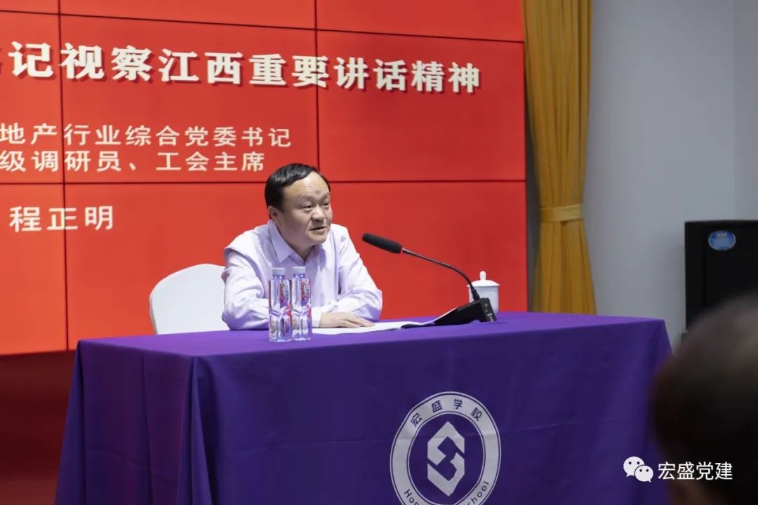 為進(jìn)一步深化理論武裝,推動(dòng)主題教育走深走實(shí),結(jié)合集團(tuán)“宏盛學(xué)?!迸嘤?xùn)班計(jì)劃安排,10月23日下午,集團(tuán)黨委邀請(qǐng)上饒市建筑房地產(chǎn)行業(yè)綜合黨委書記、市住建局四級(jí)調(diào)研員、工會(huì)主席程正明,就學(xué)習(xí)貫徹習(xí)近平總書記視察江西時(shí)重要講話和主持召開進(jìn)一步推動(dòng)長江經(jīng)濟(jì)帶高質(zhì)量發(fā)展座談會(huì)重要講話精神作主題宣講。宣講會(huì)以“線上+線下”形式舉行,集團(tuán)黨委委員、綜合發(fā)展中心總經(jīng)理陸冰主持會(huì)議,集團(tuán)黨委成員、全體中高管和黨員聆聽宣講。