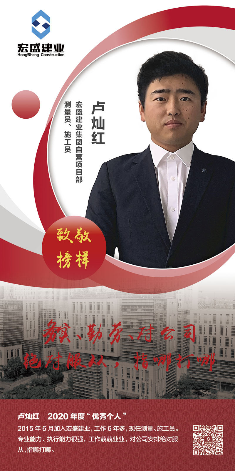2015年加入宏盛,入司6年來,服務(wù)過多個集團(tuán)項(xiàng)目。他參建的項(xiàng)目大多都獲評各級優(yōu)秀工程質(zhì)量獎。