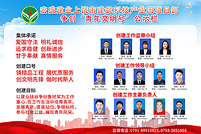 自工作開展以來,項目部始終圍繞集團經(jīng)營管理目標和上饒建筑科技產(chǎn)業(yè)園建設(shè)工作任務(wù),始終堅持“敬業(yè)、協(xié)作、創(chuàng)優(yōu)、奉獻”的精神內(nèi)涵,爭創(chuàng)“服務(wù)一流、管理一流、文化一流、人才一流、業(yè)績一流”五個一流,帶動青年職工們,在團結(jié)協(xié)作、互幫互助的工作氛圍中,立足崗位展風(fēng)采,爭創(chuàng)魯班齊奮進,同時,在集團和項目部的統(tǒng)籌安排下,積極參與社會實踐,熱心公益,奉獻社會。