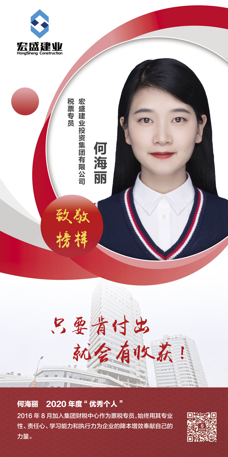 在我們的生活工作中,總有那么一群優(yōu)秀的人,他們始終保持愛崗敬業(yè)、無私奉獻(xiàn)的熱情奮戰(zhàn)在一線,燃燒自己去照亮每一個(gè)平凡的崗位。宏盛建業(yè)投資集團(tuán)2020年度“優(yōu)秀個(gè)人”——財(cái)稅管理中心何海麗便是其中一位。