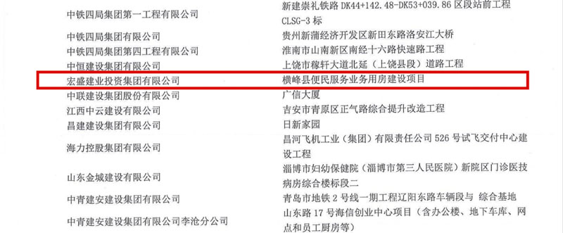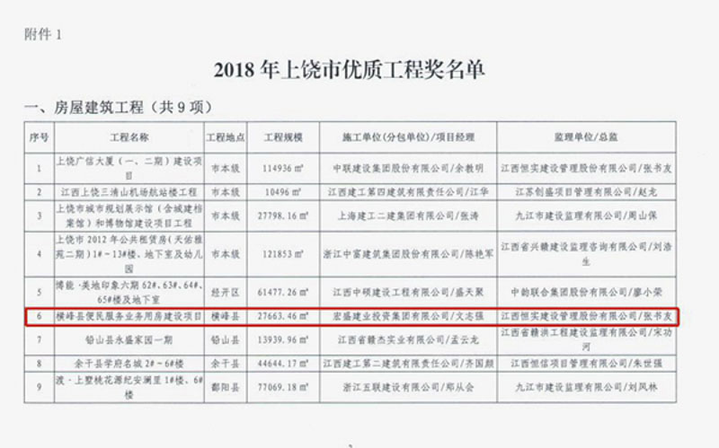 集團承建項目橫峰縣便民服務(wù)業(yè)務(wù)用房項目獲評2018年度上饒市優(yōu)質(zhì)工程獎、2018年度上饒市建筑安全生產(chǎn)標(biāo)準(zhǔn)化示范工地獎;上饒建筑科技產(chǎn)業(yè)園總部經(jīng)濟園項目,萬年縣完全中學(xué)、六〇小學(xué)、智慧校園管理中心、第三幼兒園工程規(guī)劃EPC總承包項目,獲評2018年度上饒市建筑安全生產(chǎn)標(biāo)準(zhǔn)化示范工地獎。