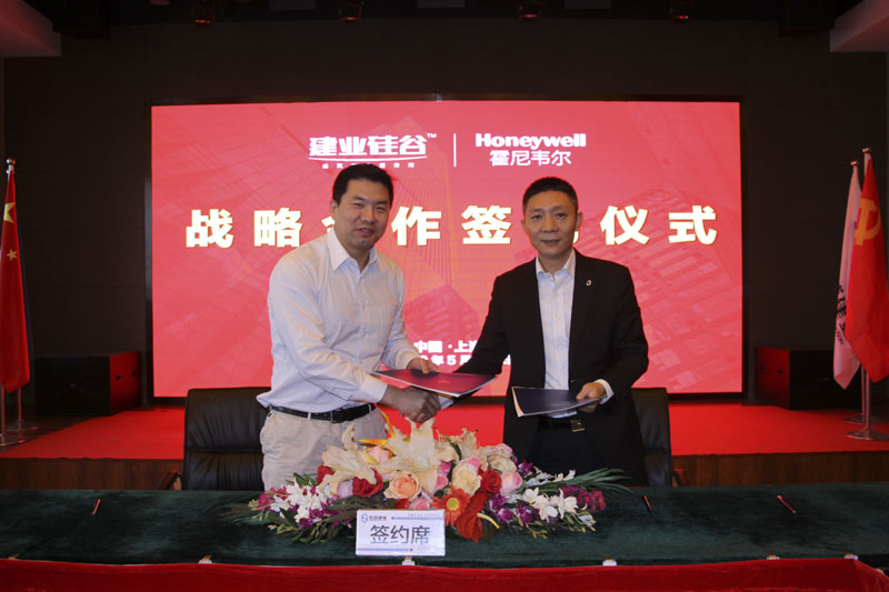 在宏盛建業(yè)上海總部,宏盛建業(yè)投資集團董事長周金虎與霍尼韋爾建筑智能系統(tǒng)部中國區(qū)總經(jīng)理楊珂簽訂長期戰(zhàn)略合作協(xié)議。