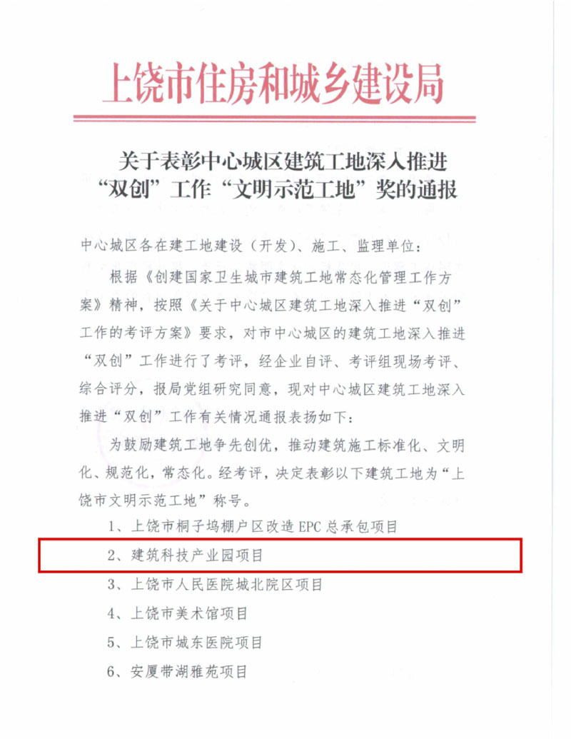 從上饒市住房和城鄉(xiāng)建設(shè)局公布的《關(guān)于表彰中心城區(qū)建筑工地深入推進“雙創(chuàng)”工作“文明示范工地”獎的通報》文件獲悉,集團投資承建的“建業(yè)硅谷”上饒市建筑科技產(chǎn)業(yè)園項目,再次獲評“上饒市文明示范工地”。