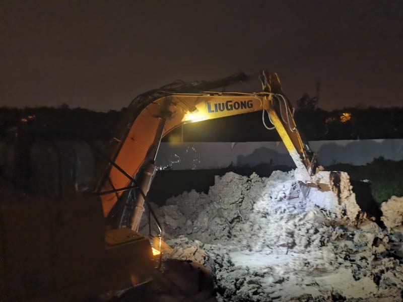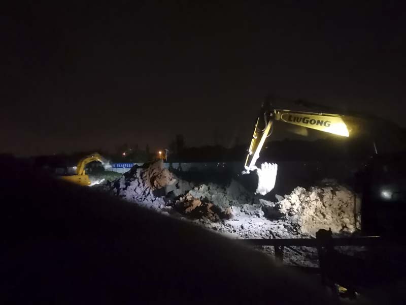 由于臨河水位的不斷上升,避免漲水淹沒我司做的地下工程,立馬調(diào)來三臺(tái)挖掘機(jī)和兩臺(tái)渣土車連夜工作,現(xiàn)場(chǎng)挖土加高項(xiàng)目南側(cè)的路面?,F(xiàn)場(chǎng)狂風(fēng)暴雨,搶險(xiǎn)支援隊(duì)的同事始終站在大雨中一絲不茍地指揮著。